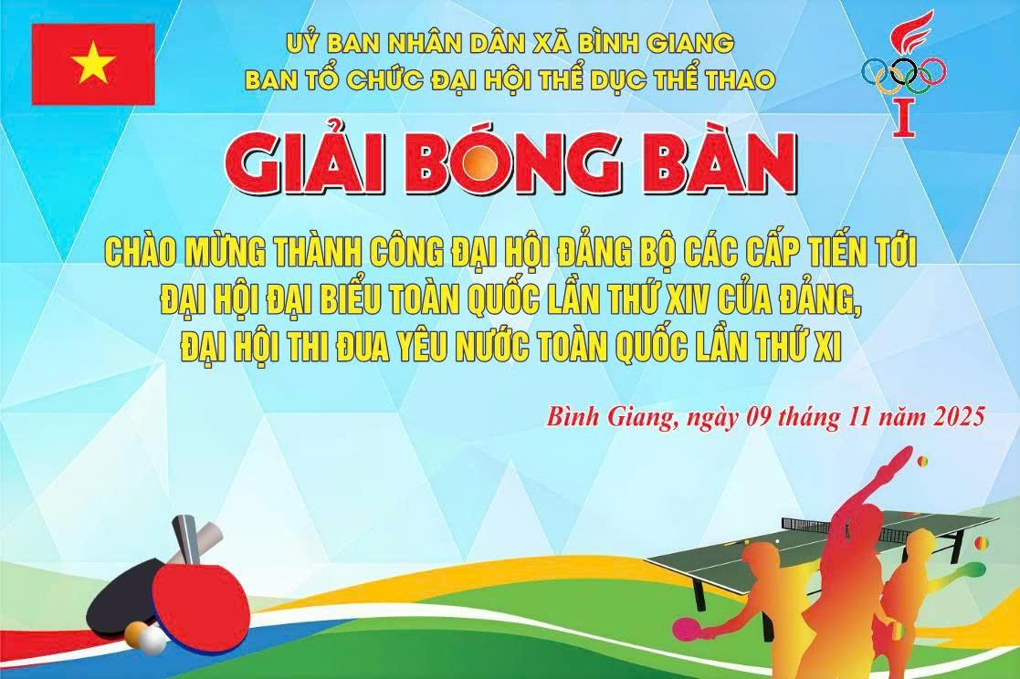 Theo kế hoạch ngày 09/11/2025 UBND xã Bình Giang sẽ tổ chức giải bóng bàn trong khuôn khổ Đại hội TDTT xã Bình Giang lần thứ I năm 2025. Thời gian tổ chức khai mạc giải Bóng bàn 7h30 và bế mạc vào 17h cùng ngày. Vậy BTC Đại hội TDTT xã Bình Giang trân trọng kính mời các đồng chí đại biểu đến dự, động viên và cổ vũ để Giải Bóng bàn trong khuôn khổ Đại hội TDTT xã thành công tốt đẹp./.