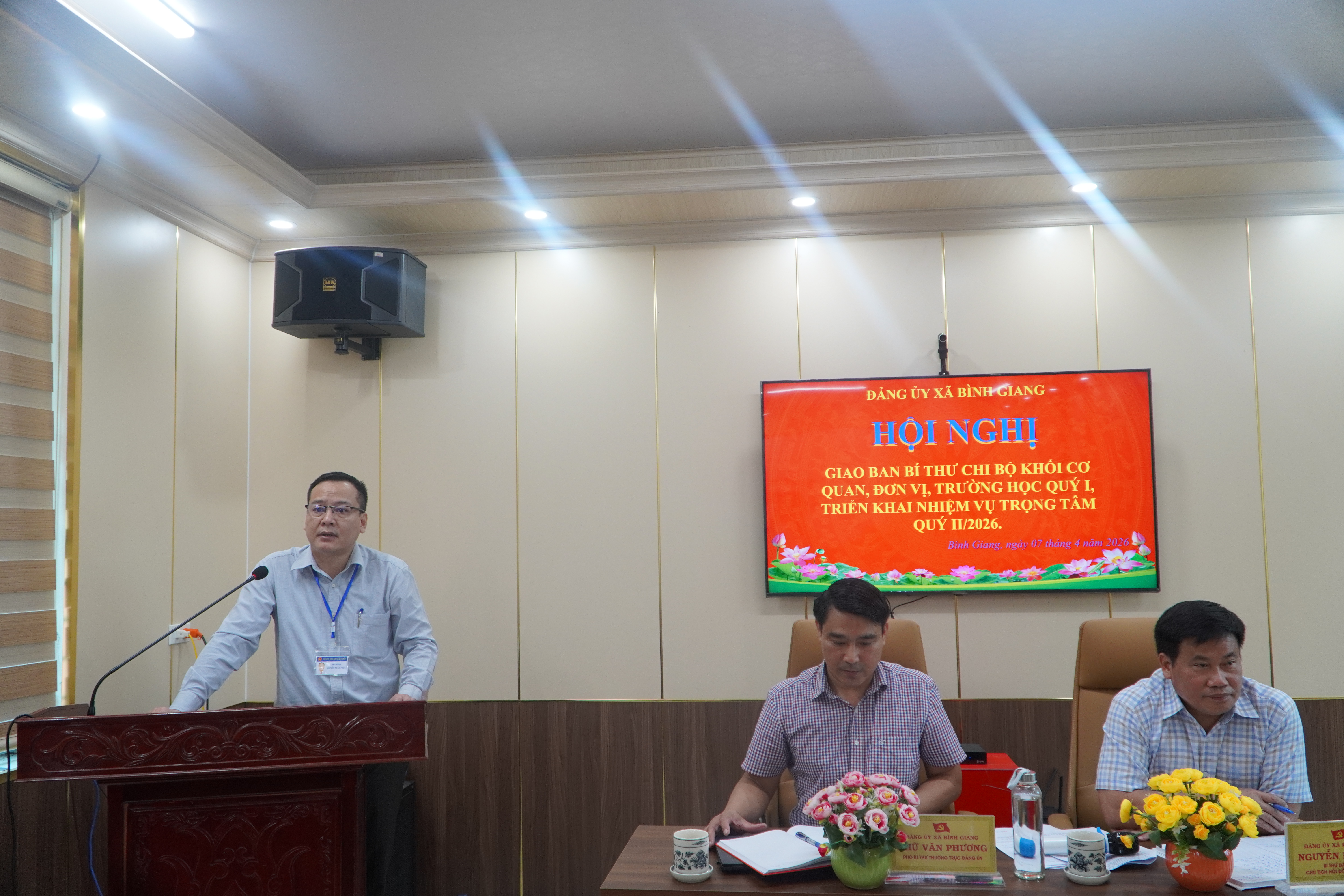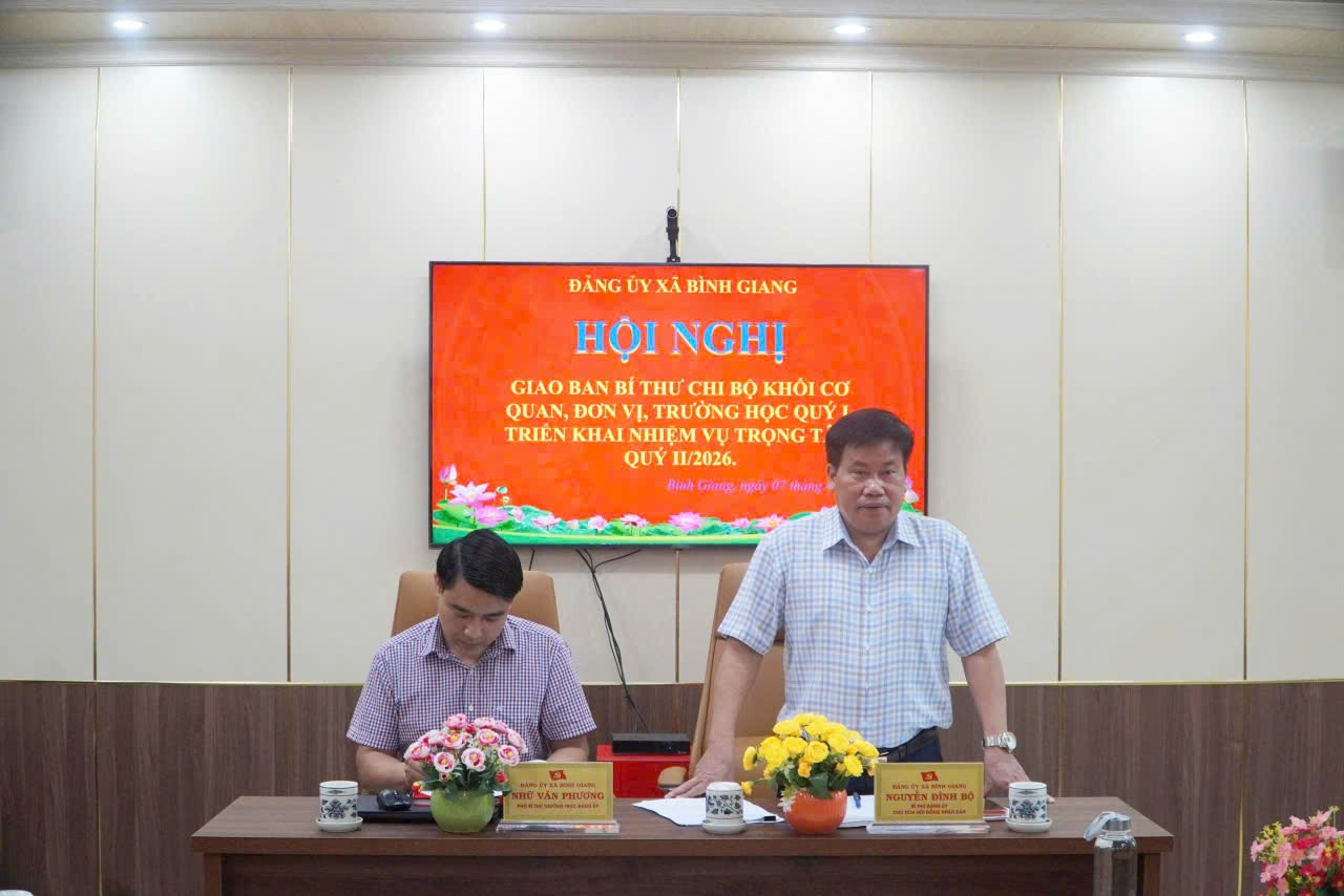 Sáng ngày 07/04/2026 Đảng bộ xã Bình Giang đã tổ chức Hội nghị giao ban Bí thư chi bộ khối cơ quan, đơn vị, trường học Quý I năm 2026 nhằm đánh giá toàn diện tình hình thực hiện nhiệm vụ công tác xây dựng Đảng trong 3 tháng đầu năm, đồng thời đề ra phương hướng, nhiệm vụ trọng tâm trong Quý II và thời gian tiếp theo.