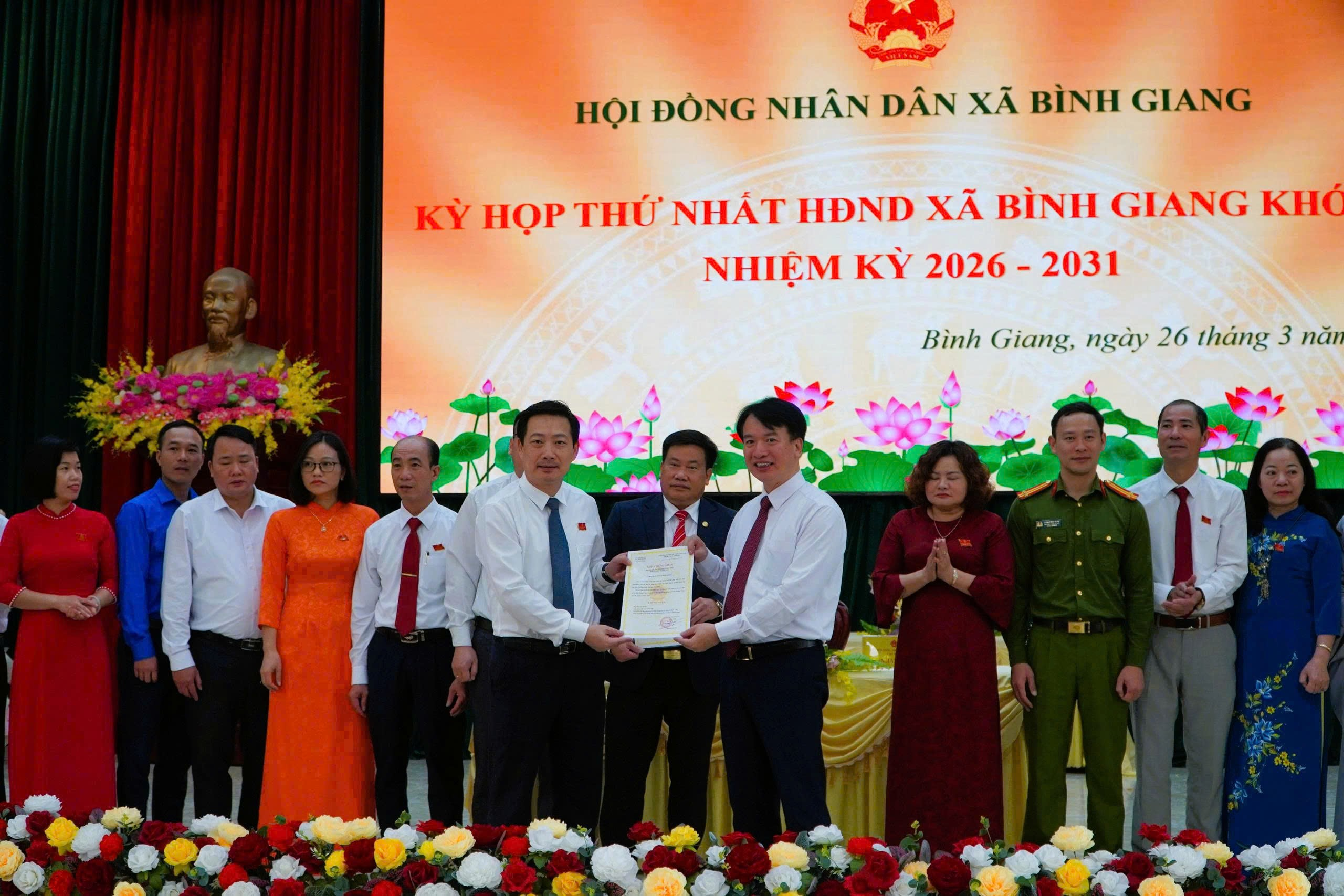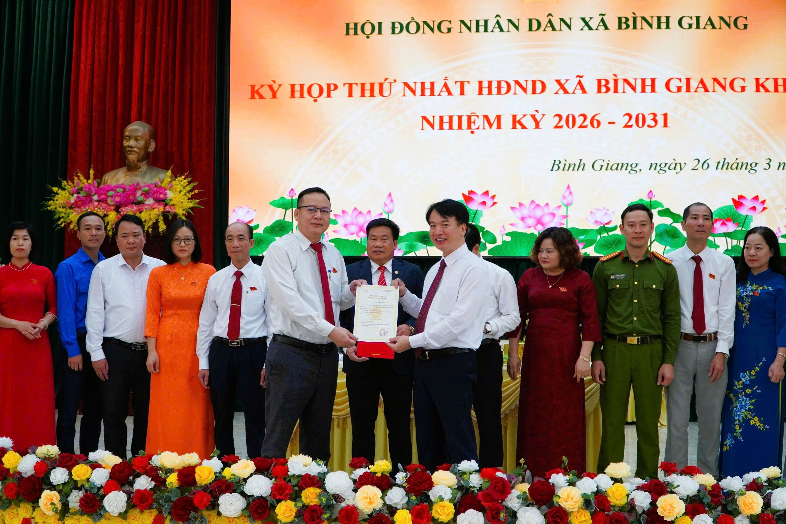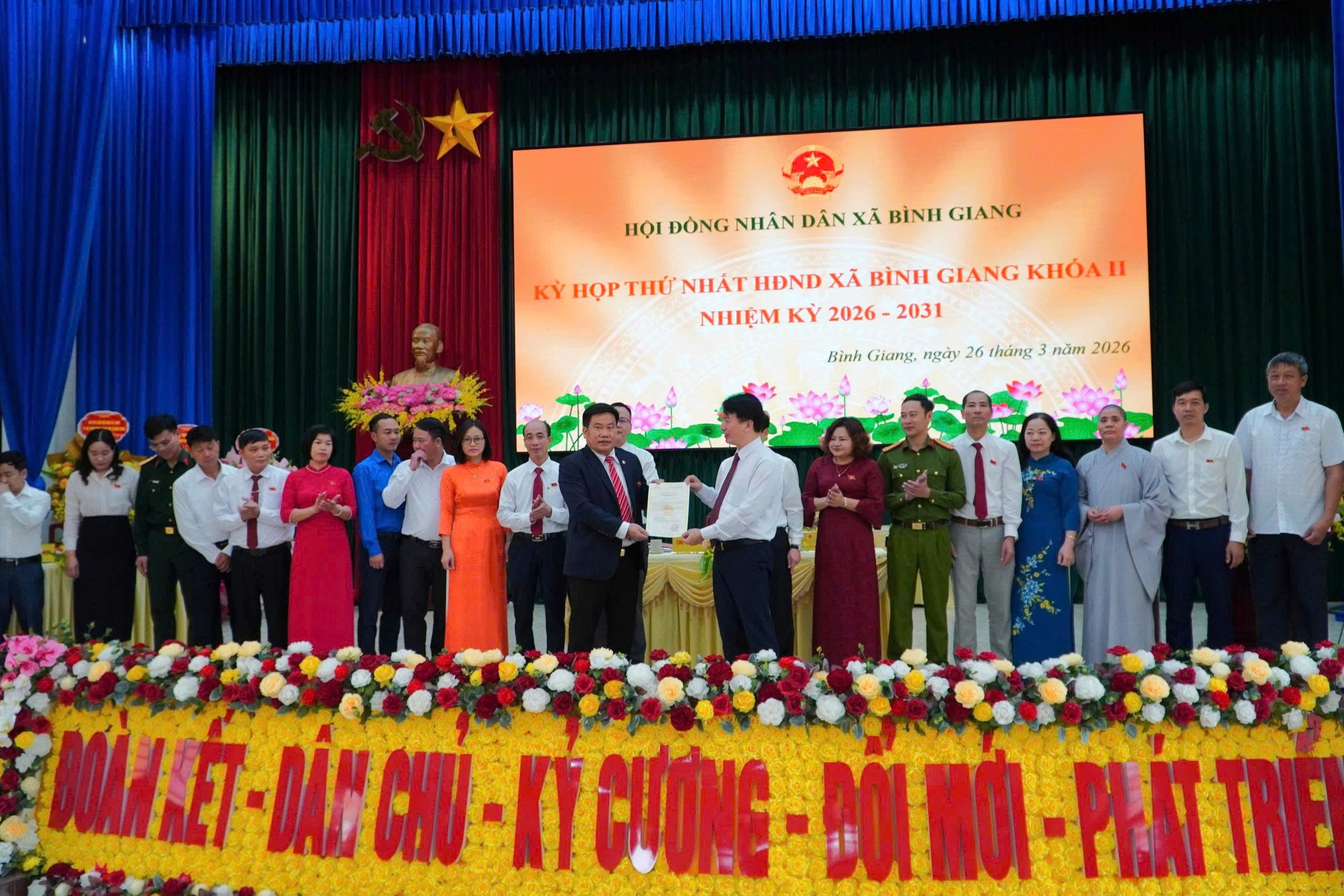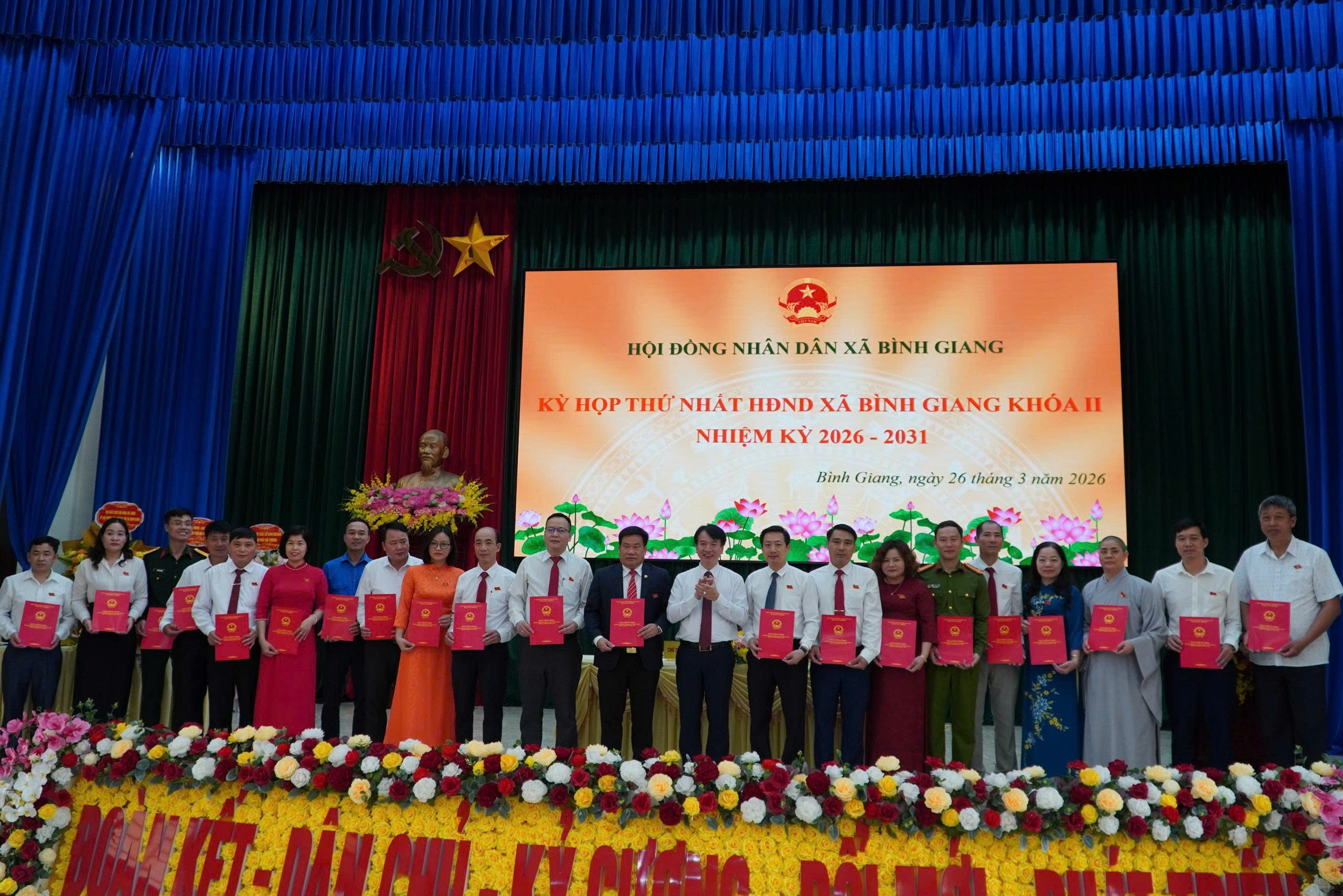 Tại kỳ họp, Uỷ ban Bầu cử xã Bình Giang trao Giấy chứng nhận cho 21 người trúng cử đại biểu HĐND xã Bình Giang khoá II, nhiệm kỳ 2026-2031.